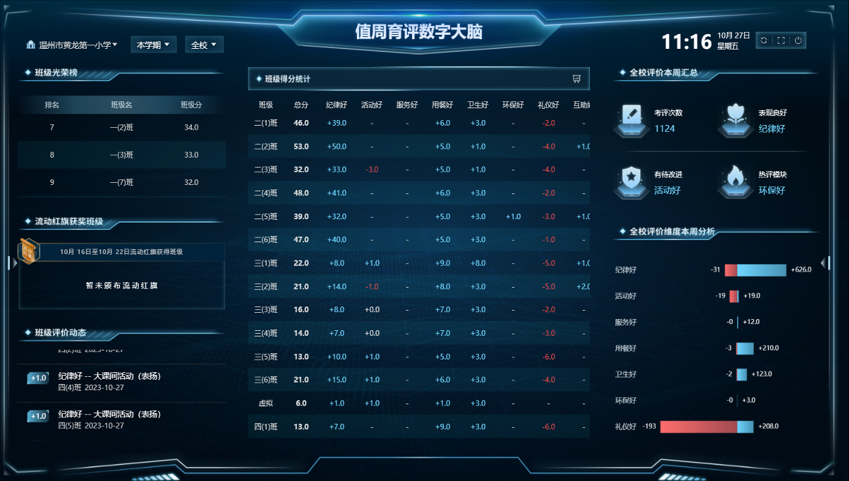 校園值周數(shù)字大屏:自動生成學(xué)生、班級、寢室評比報告、學(xué)校管理好幫手