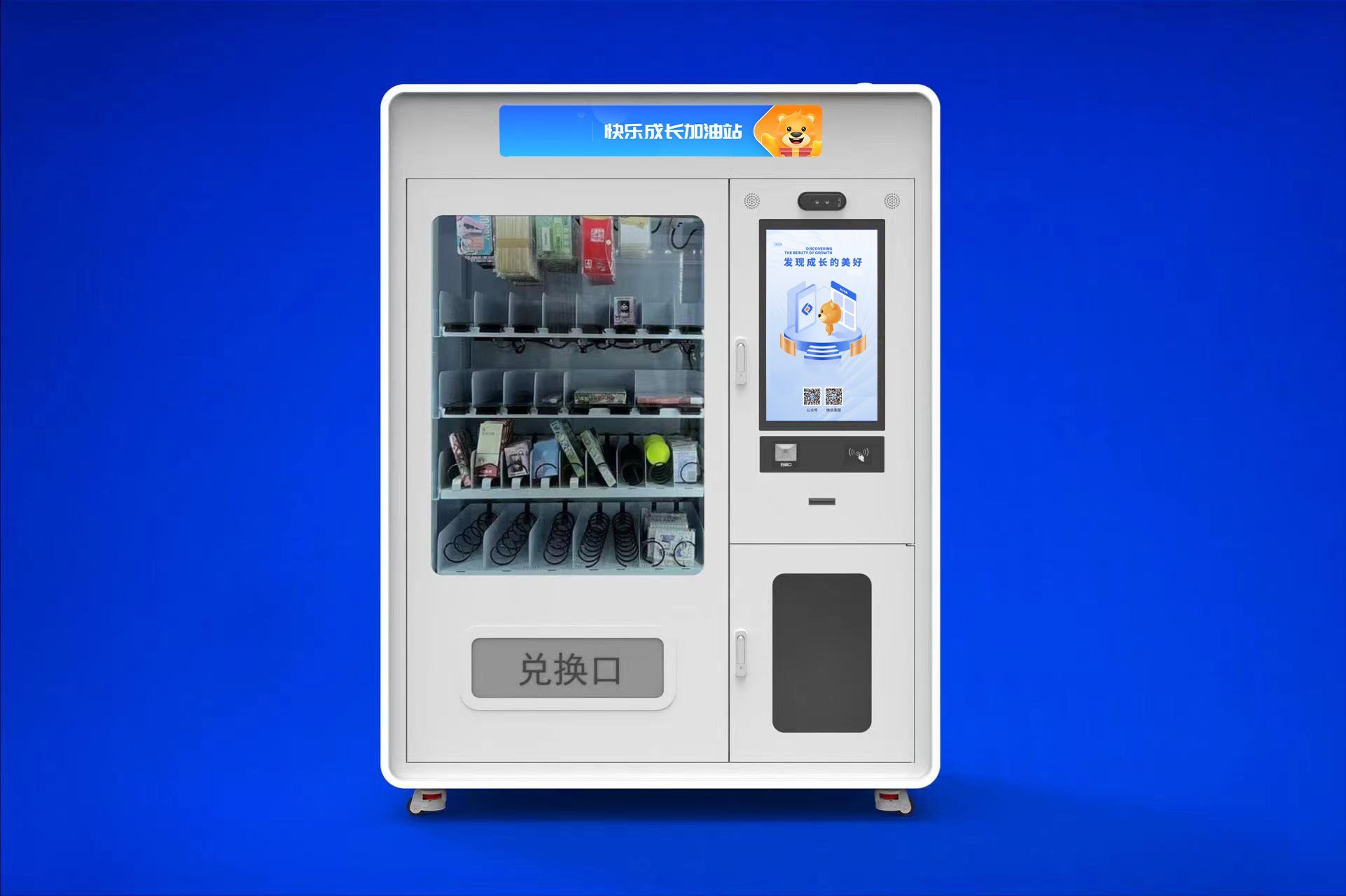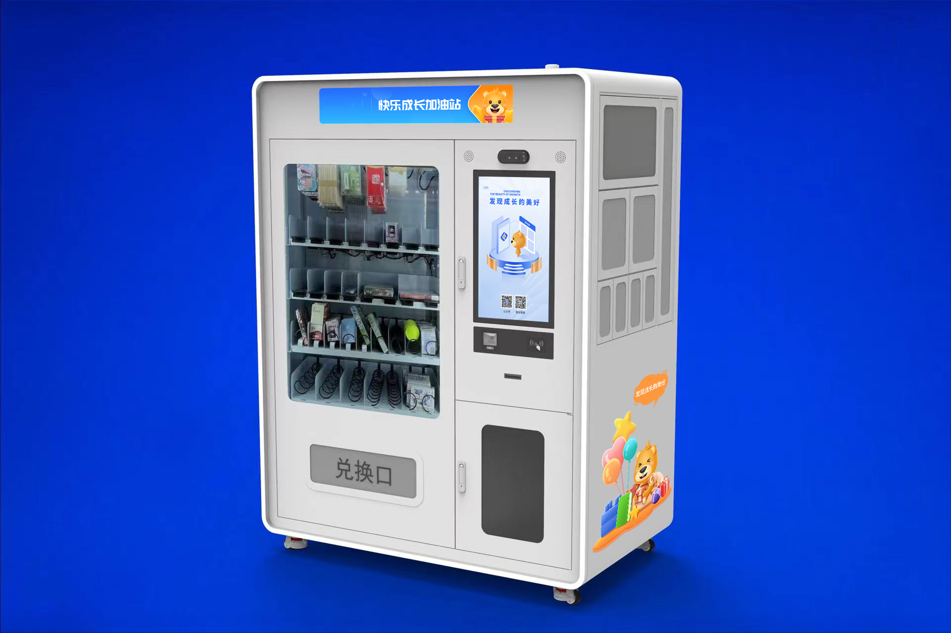 4、三個(gè)展示儲(chǔ)物箱:默認(rèn)配置了三個(gè)大空間防爆透視展示儲(chǔ)物箱,其中下部展示儲(chǔ)物箱可用作收卡箱,便于回收學(xué)生成長(zhǎng)卡。