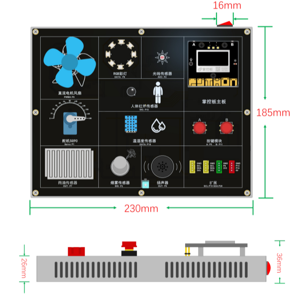★包含人體紅外傳感器、光線傳感器、溫濕度傳感器、RGB彩燈、直流電機(jī)風(fēng)扇、舵機(jī)、雨滴傳感器、揚(yáng)聲器、AI攝像頭、語音合成、以及按鍵、擴(kuò)展等模塊;