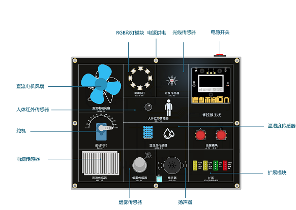 1、包含人體紅外傳感器、光線傳感器、溫濕度傳感器、RGB彩燈、直流電機(jī)風(fēng)扇、舵機(jī)、雨滴傳感器、揚聲器、擴(kuò)展模塊等。